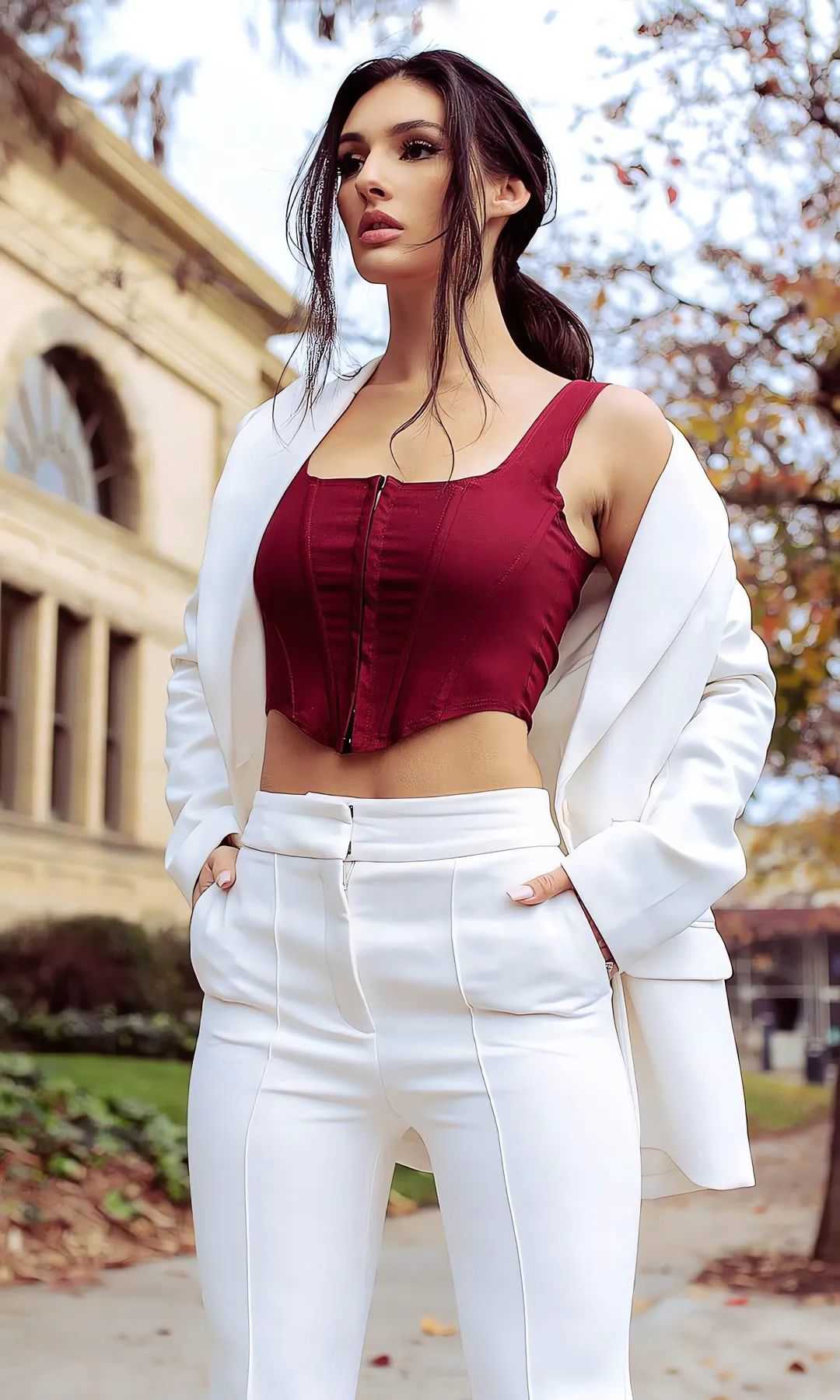 In a sunlit kitchen, the model leans against a wooden counter, clad in a neutral-toned linen shirt and jeans. The soft glow of morning light highlights the texture of her outfit and the gentle curve of her smile as she stirs a cup of coffee—a scene that feels both intimate and inviting. Elsewhere, she stands against a weathered brick wall in a bustling neighborhood, her posture relaxed yet statuesque in a tailored blazer and ankle boots. The urban grit of the background contrasts with her serene expression, creating a striking visual narrative.